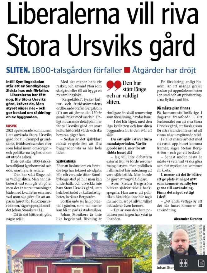 En artikel i Mitt i Sundbyberg 4/10 uppmärksammar Liberalernas ståndpunkt att Stora Ursviks gård tyvärr bör rivas. Förfallet har gått för långt, medan nuvarande styre bara passivt sett på. Huset, byggt 1873, står alltjämt igenbommat och öde – alldeles intill Kymlingeskolan, mycket centralt i Stora Ursvik.